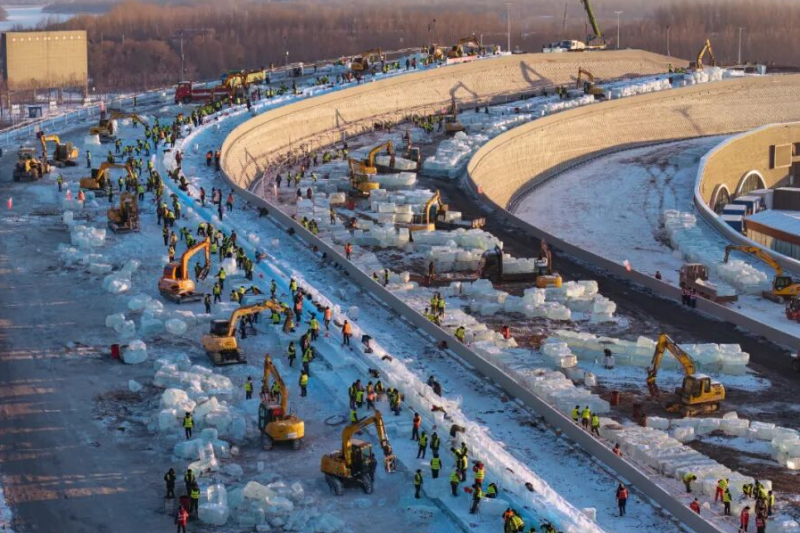 近日,哈尔滨冰雪大世界园区内一派繁忙景象,新一季冰雪盛会的建设工作已全面展开。20万立方米存冰投入冰建施工的同时,前期的人工造雪也为园区地面铺垫及部分雪雕建设打下了坚实基础。