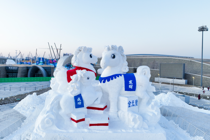 今天,哈尔滨冰雪大世界南售检票大厅外上演了一场特别的“焕装仪式”,巨型雪雕“童话小马一家”四口穿上了彩色服饰,喜庆可爱、萌态十足。