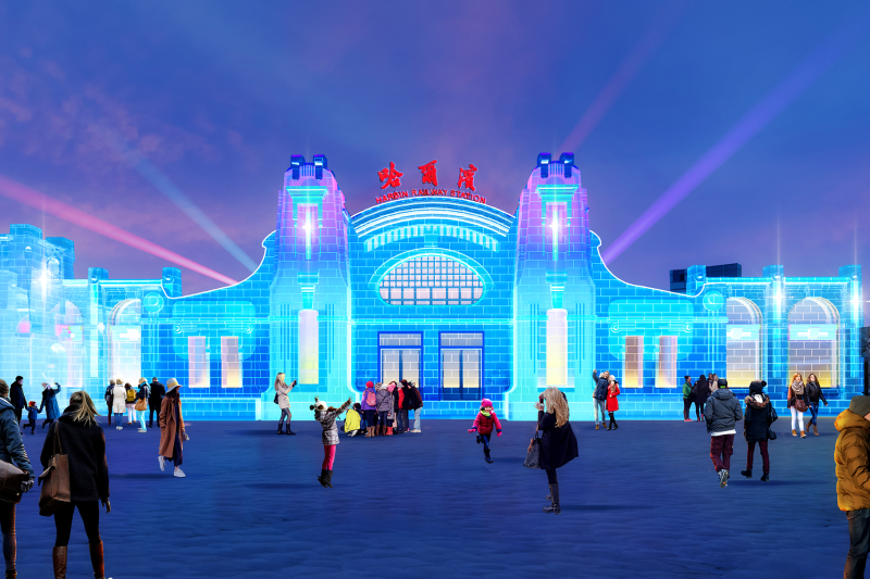 经过施工人员连续多日昼夜奋战,12月10日17时18分,第二十七届哈尔滨冰雪大世界主塔“冰灯启梦”完成了最后一块冰体的砌筑,正式封顶。接下来,主塔将进入最后的细节打磨和灯光调试阶段。