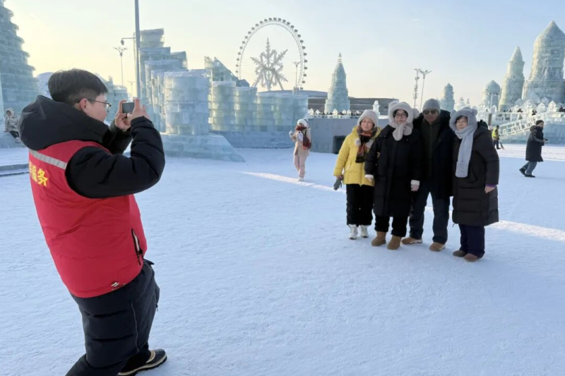 在哈尔滨冰雪大世界园区,总会有一抹红,适时出现在需要帮助的游客身边,为游客指引路线、找寻失物、拍照合影,他们用专业为游客做出最快的选择,用耐心解答每位游客的疑问,用笑容感染每一位冰雪来客。