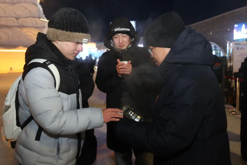 姜茶热饮免费尝,暖心暖手暖心房。在哈尔滨冰雪大世界园区,接近零下二十度的空气里却飘着游客们攒动的热气。