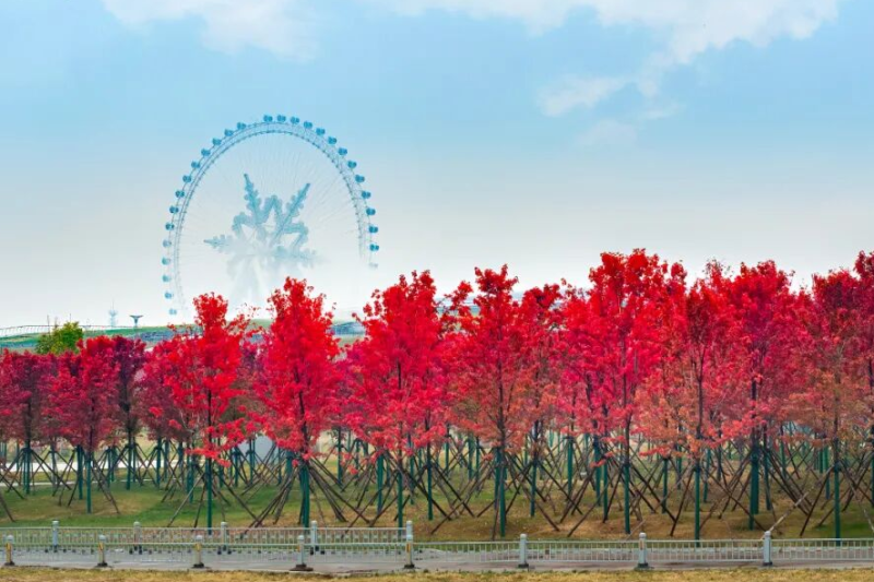 当时光走到北国冰城的深秋,哈尔滨冰雪大世界园区外,热烈“绽放”的红枫正以最动人的姿态,描绘着独属于秋日的浪漫。